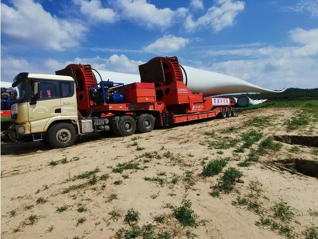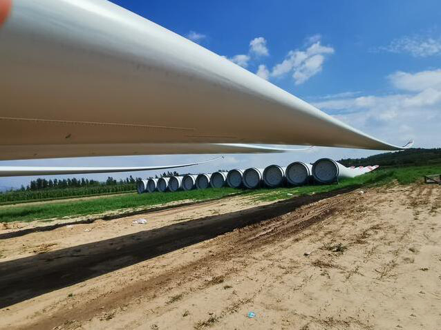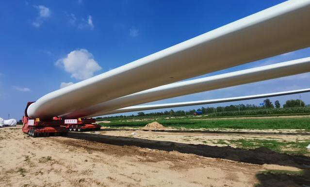 這些卡車上拉著的很大、很長、像飛機翅膀一樣的龐然大物就是風(fēng)力發(fā)電機的葉輪,就是我們所說的葉片??傞L度60多米,二十多噸重。